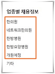위 사이트의 장점은 한의원이라는 한 가지 직종에 특화된 사이트다 보니 다른 잡사이트에서는 볼 수 없는 채용정보가 있는 것이 특징이라고 할 수 있습니다.