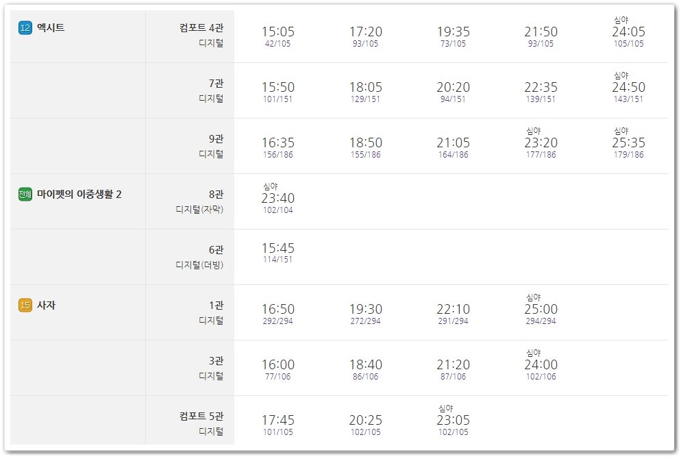 8월 1일 기준으로 엑시트가 예매순위 1위를 기록하며 가장 많은 상영관에서 상영이 되고 있습니다. 대부분 오후 시간대로 구성이 되어 있습니다.