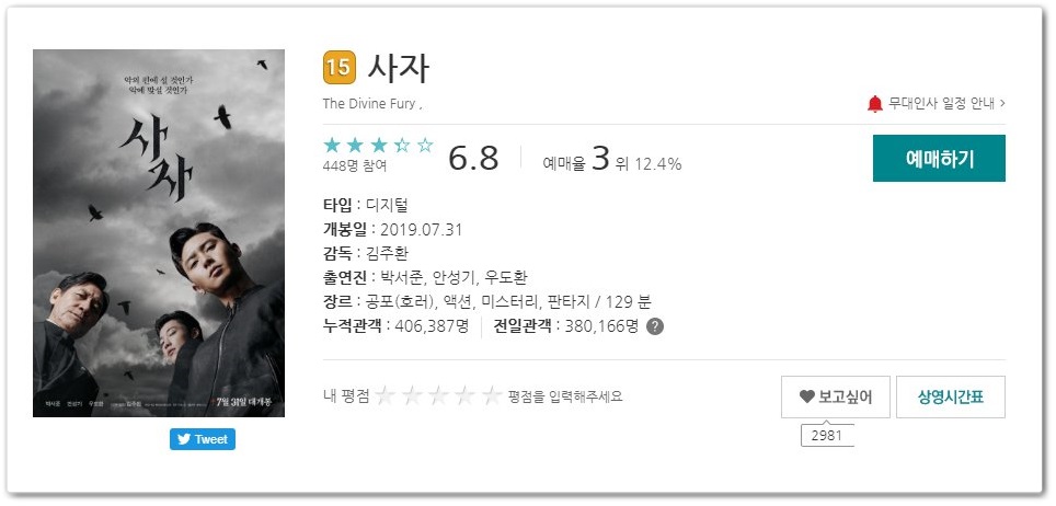 현재 영화예매울은 3위이지만 많은 분들이 관람 후기가 올라오면서 점점 흥행하지 않을까 생각해 봅니다.