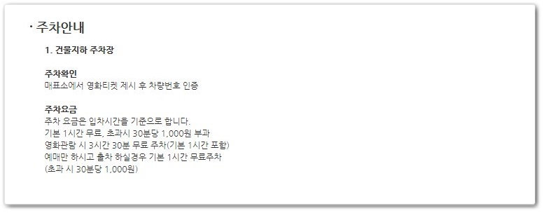 메가박스 천안점 주차요금의 경우 당일 관람객에게 3시간 30분의 주차를 제공하고 있습니다. 영화 한 편 보기에 충분한 시간이니 영화도 보고 간단히 식사도 할 수 있을 것 같습니다.