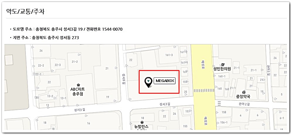 메가박스 충주점 안내입니다. 주소가 안내되어 있어 자가용 이용 시 쉽게 찾아가실 수가 있습니다.