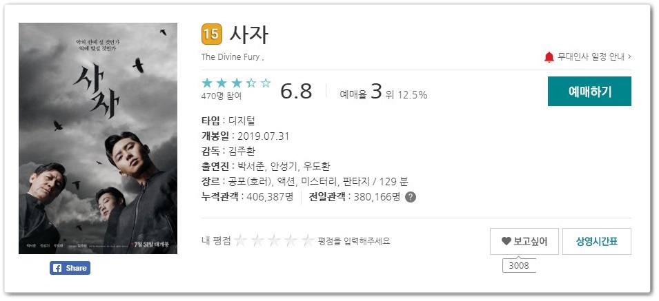 안성기, 박서준, 우도환 씨가 주연을 맡았습니다. 영화 사자는 퇴마를 주제로 한 이야기입니다. 무더움 여름 호러물이 빠지면 안 되겠죠.