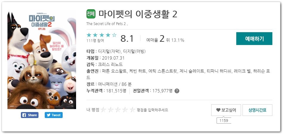 메가박스 영화 예매율 2위는 어린이 애니메이션 마이펫의 이중생활 2가 차지했습니다.