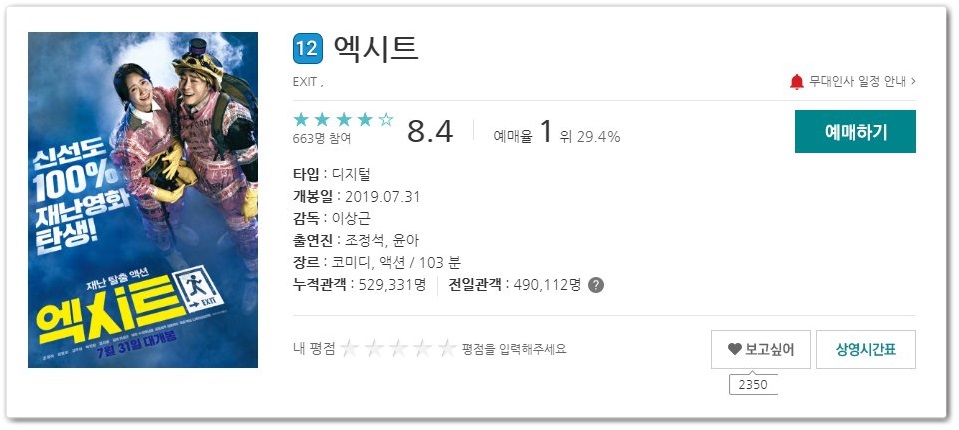먼저 1위는 엑시트입니다. 7월 31일 개봉한 영화입니다. 코미디, 액션물로 조정석, 윤아 씨가 주연을 맡았습니다.