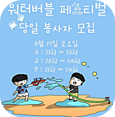 시원한 물놀이도 즐기고 맛있는 먹거리와 체험할 수 있는 다양한 이벤트가 준비되어 있으니 꼭 참석해보셔서 즐거운 시간을 보내시길 바랍니다.