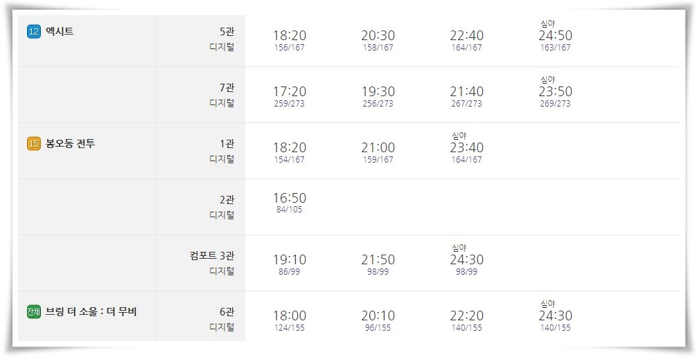 가장 인기가 많은 엑시트가 오늘 하루 8번의 상영이 예정되어 있습니다. 새롭게 개봉한 봉오동 전투도 예매순위 2위답게 7번의 상영이 예정되어 있습니다.