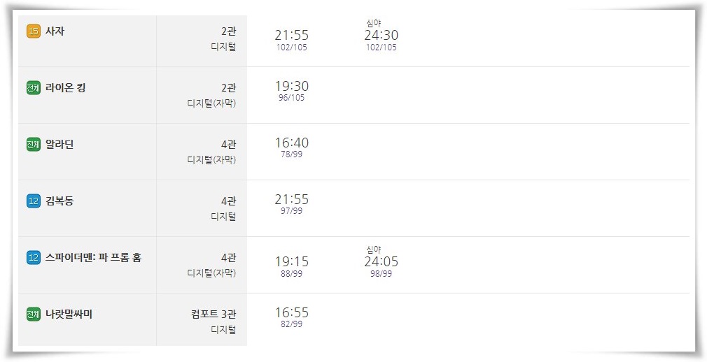 이밖에도 꾸준한 사랑을 받고 있는 사자, 알라딘, 라이온 킹, 스파이더맨 파 프롬 홈도 눈에 띄는 것 같습니다. 영화 종류가 너무 많아서 고르기 힘든 분들은 예매순위대로 골라 보시는 것도 좋을 것 같습니다.