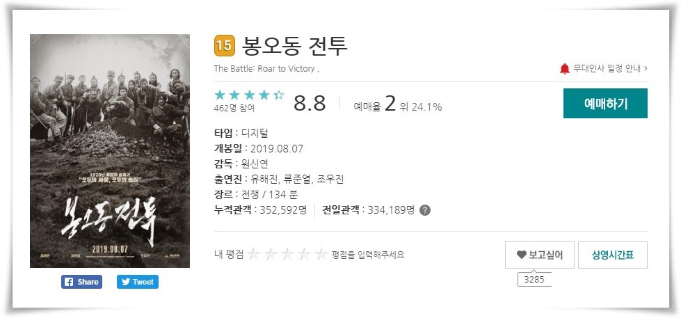 8월 7일 개봉한 봉오동 전투가 개봉과 동시에 인기를 얻으면서 예매율 2위를 달리고 있습니다.