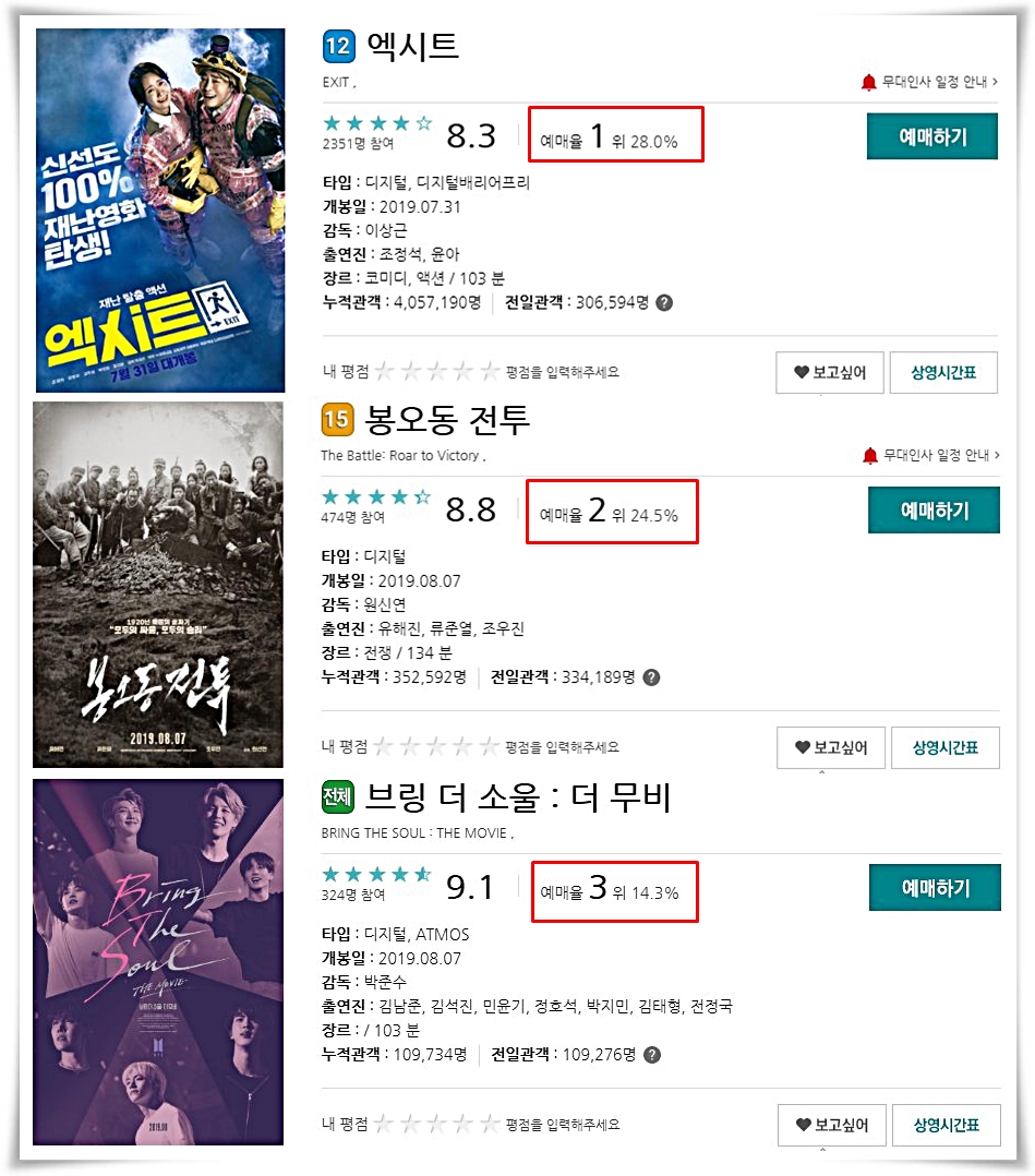 현재 예매율 1~3위는 엑시트, 봉오동 전투, 브링 더 소울 : 더 무비가 차지했습니다.