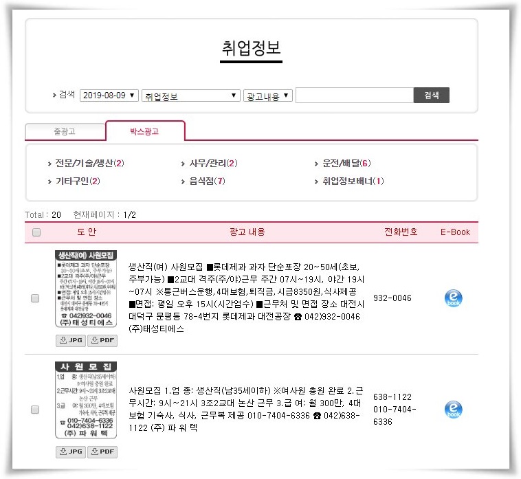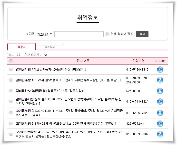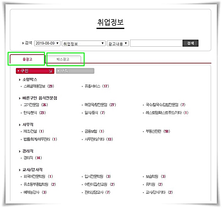 취업정보는 불광고 형태와 박스광고 형태 두 가지로 구분되어 있다. 줄광고는 한 줄 형식으로 읽기 편하게 되어있는 것이 장점이다.