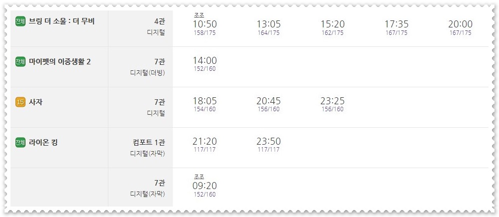 현재 상영작은 총 10편으로 안내가 되고 있습니다. 엑시트, 봉오동 전투, 브링 더 소울, 마이펫의 이중생활 2, 사자, 라이온 킹, 앵그리 버드 2 독수리 왕국의 침공, 레드 슈즈, 알라딘, 김복동입니다.