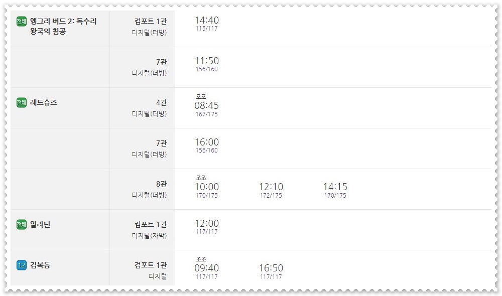 지금 소개하는 상영시간표는 작성일 기준입니다. 다른 날짜 상영시간표가 궁금하신 분들은 메가박스 동탄점 홈페이지를 참고하시기 바랍니다.