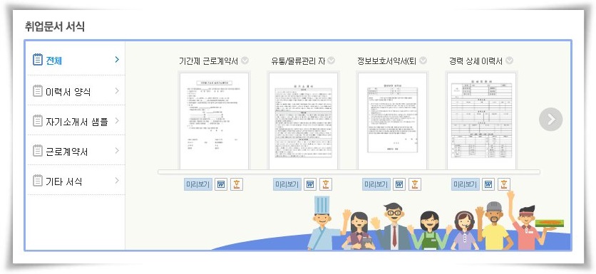 해당 게시판을 살펴보면 이력서 양식부터, 자기소개서 샘플, 근로계약서 양식 등이 제공되고 있어 구직자나 구인자 모두 유용하게 도움이 되고 있습니다.