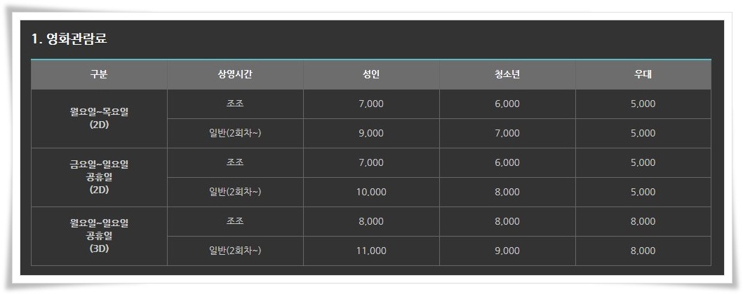 조조영화를 제외한 2회 차부터 10,000원의 요금을 받는데요 롯데시네마는 11,000원인데 1,000원 정도 저렴한 것 같습니다.