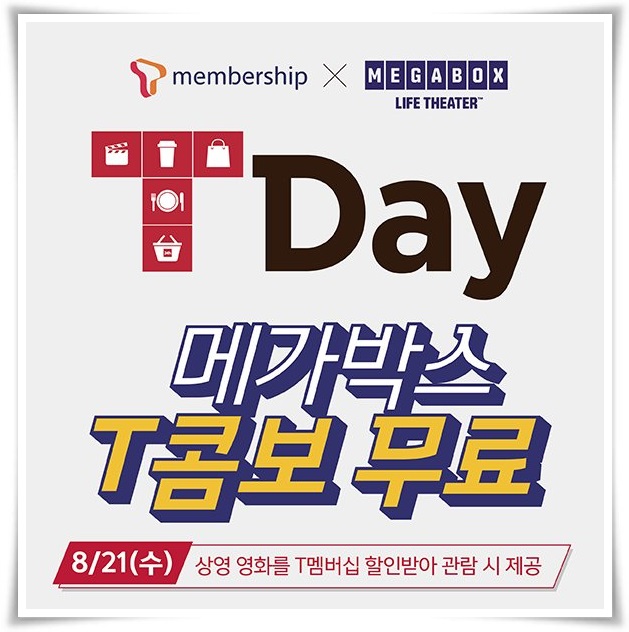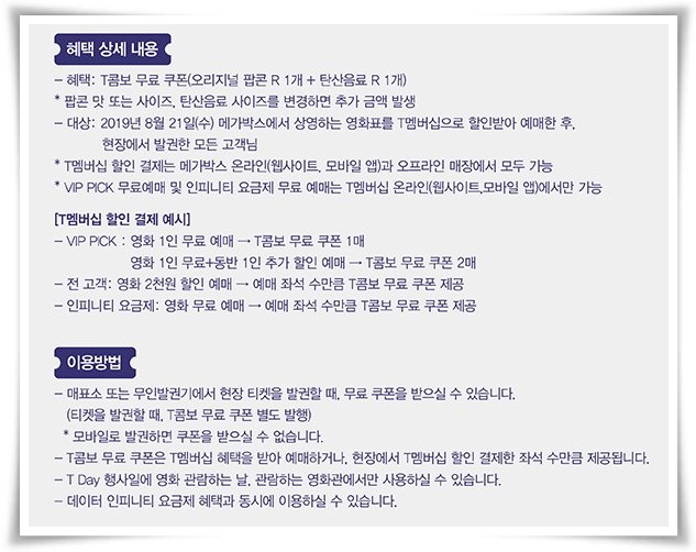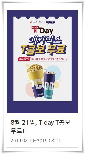 마침 8월 21일 메가박스 T데이 T콤보 할인 이벤트가 나와 있습니다. 영화표 예매 시 T멤버십 카드로 할인받아서 구매한 분들에게만 무료콤보 쿠폰을 제공해 주고 있다고 합니다.