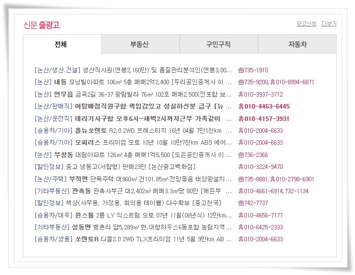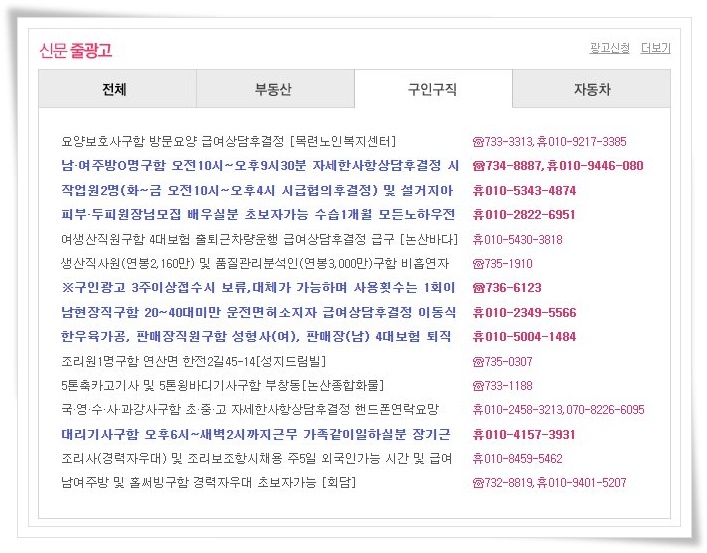 그런 점에서 백제 교차로 구인구직 게시판은 신문 줄광고가 한 줄로 정렬되어있어 나이가 드신 분들도 이용하기가 편리한 것 같습니다.