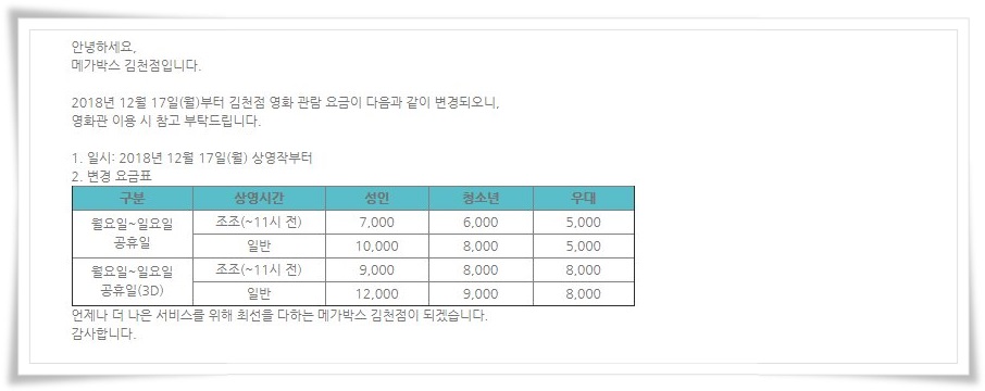 김천 메가박스 요금 안내 |