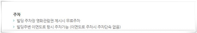 주차단속이 없기 때문에 영화를 맘 편히 볼 수가 있으니 참고하시기 바랍니다. 혹시라도 걱정이 된다면 빌딩 주차장에도 주차가 가능하며 역시 주차장은 무료로 운영되고 있습니다.