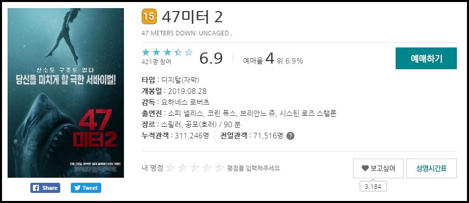 47미터 2는 공포영화로 스릴감이 넘치는 것이 특징이라고 합니다.