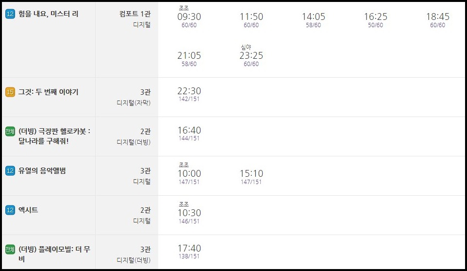 다음은 오늘 기준 메가박스 검단점 영화 시간표 입니다. 영화예매시 참고하시고 매일 시간표가 변경되니 자세한 시간표는 홈페이지를 참고하시기 바랍니다.
