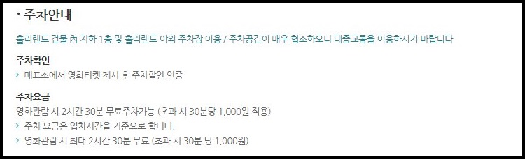주차공간이 협소한 편이라 대중교통을 이용하는 것이 좋다고 합니다. 주차요금의 경우 당일 영화 관람객은 2시간 30분의 무료주차를 제공하고 있습니다.