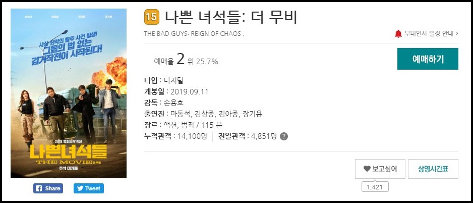 영화예매순위 2위를 달리고 있는 영화는 나쁜 녀석들 더 무비입니다.
