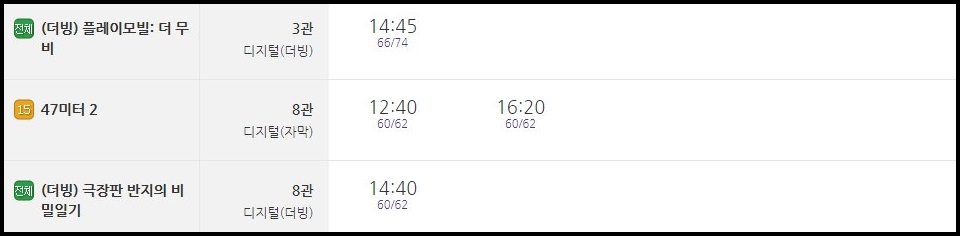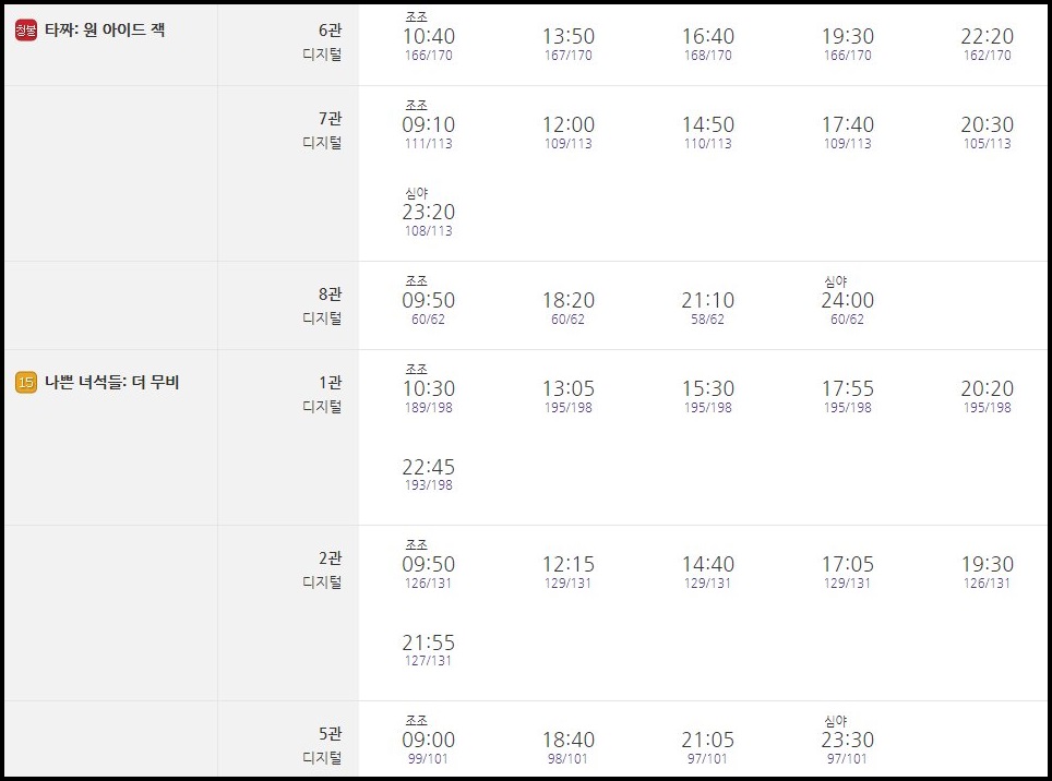 최근 가장 인기가 많은 영화들 답게 대부분의 상영관이 예매순위가 높은 영화들로 가득 차 있습니다.