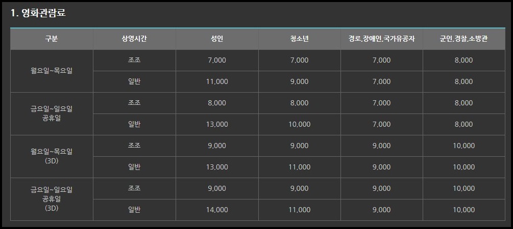 물론 영화관마다 좌석과 시설등이 다 다르기 때문에 그렇지만 관람료가 다소 부담이 되시는 분들은 영화요금 비교를 하시는 것도 좋을 것 같습니다.