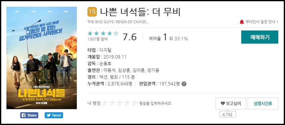 나쁜 녀석들 더 무비는 추석 연휴에 개봉하면서 흥행 1위와 함께 예매율 1위를 달리고 있는 영화입니다.