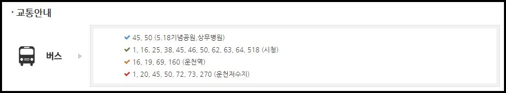 시내 중심가에 위치하고 있어서 다소 교통이 혼잡스러워서 대중 교통을 이용하시는 분들도 많은데요. 5.18 기념공원 앞에 위치하고 있기 때문에 다양한 버스노선이 있으니 참고하시기 바랍니다.