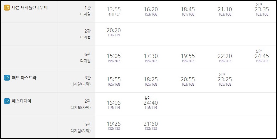 총 6편의 영화가 상영 중으로 소개되고 있으며 심야영화도 있으니 퇴근 후에 영화를 보시기에도 좋을 것 같습니다.