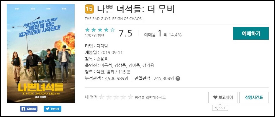 영화예매 순위에서 1위를 달리고 있는 영화는 나쁜 녀석들 더 무비입니다.