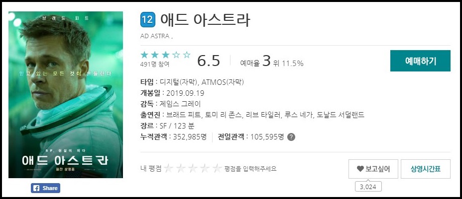 오랜만에 영화로 돌아온 브래트 피트가 주연한 애드 아스트라는 현재 영화 예매순위 3위를 달리고 있습니다.