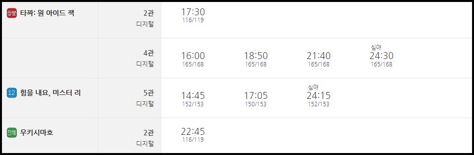 구미강동 메가박스 상영시간표를 보면 평일이라 그런지 상대적으로 적은 영화가 상영 중입니다.