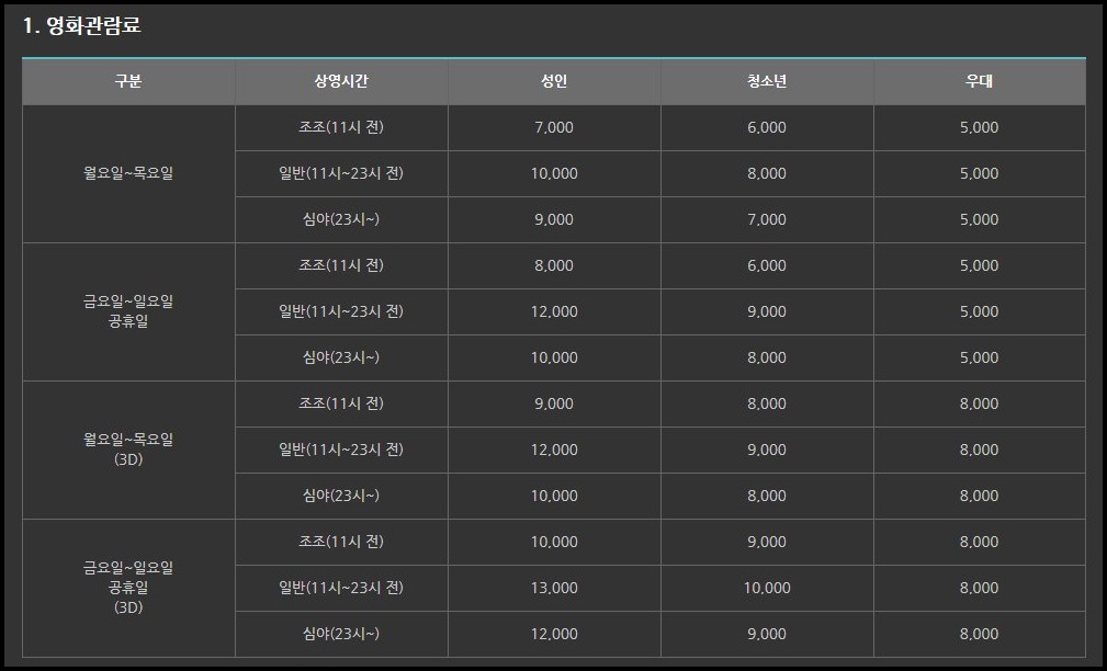 대부분의 메가박스, cgv 롯데시네마의 경우 주중, 주말 요금이 다르게 책정되어 있습니다.