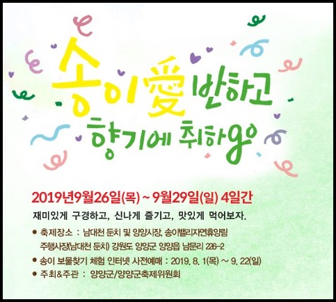 강원도 2019 양양송이축제는 2019 9월26일(목)~29일(일) 4일간 진행이 됩니다.