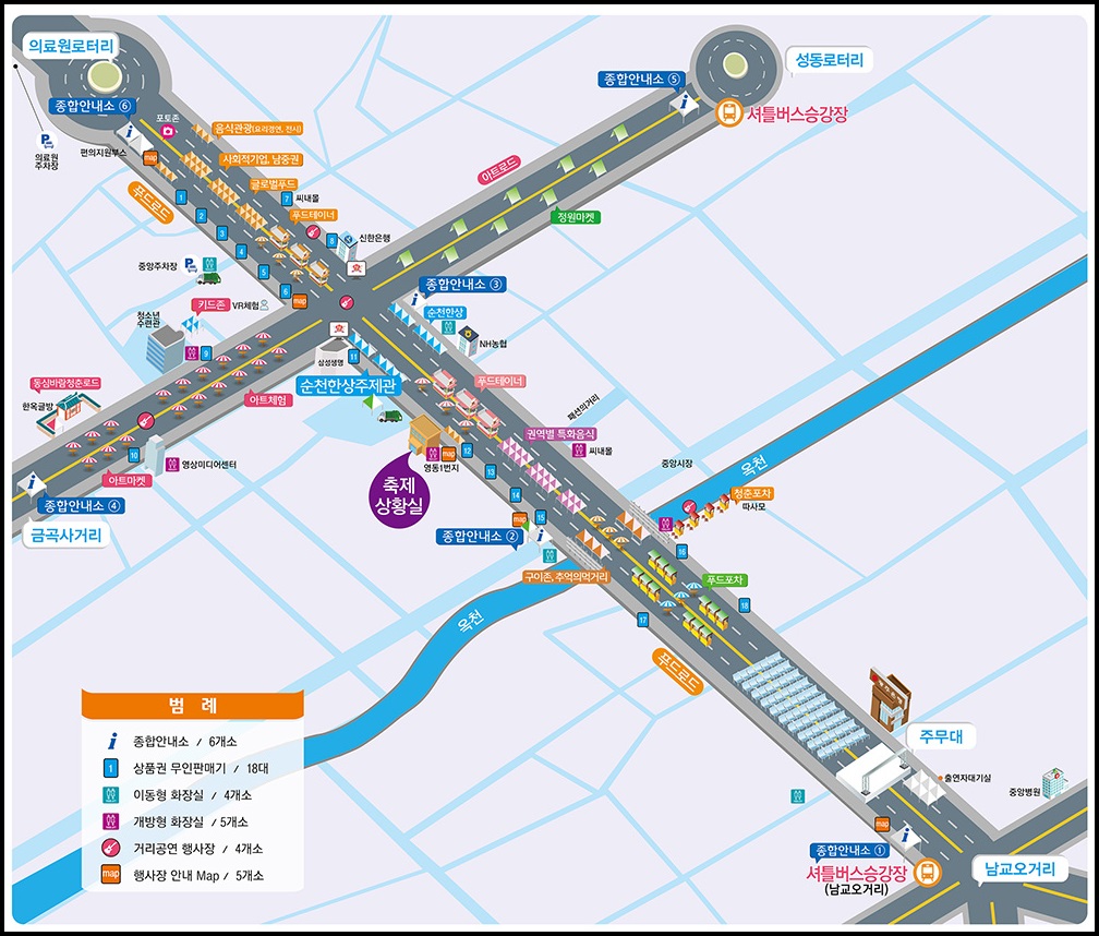 순천 푸드아트 페스티벌 전체 배치도를 살펴보면 6개의 종합 안내소 및 이동식 화장실 거리공연 행사장 등 관광객들이 불편함을 느끼지 않게 최대한 노력한 흔적을 엿볼 수 있습니다.