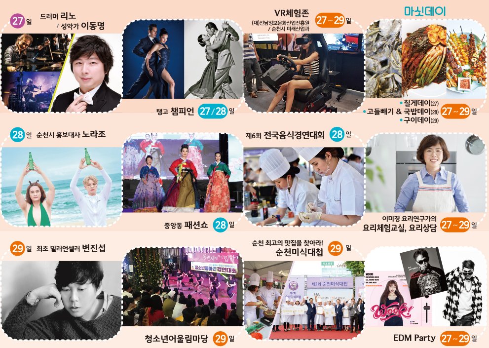 순천시 홍보대사인 노라조와 가수 변진섭 씨, 패션쇼, 미식 대첩, 요리 상담, 요리경연대회 등의 공연도 준비되어 있다고 하니 즐거운 축제가 될 것 같습니다.