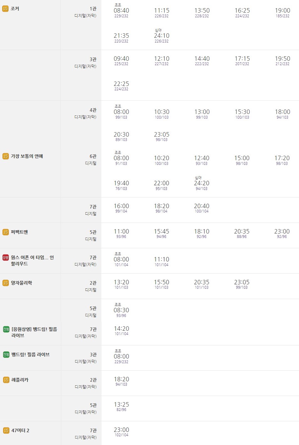 오늘 기준 강남 메가박스 상영시간표입니다.