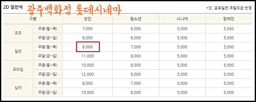 광주광역시 대인동에 위치한 롯데시네마 광주점과 비교해보면 평일 요금이 8,000원 인데 광주 상무 메가박스 평일 요금의 경우 11,000원으로 3,000원 정도 차이가 있습니다.