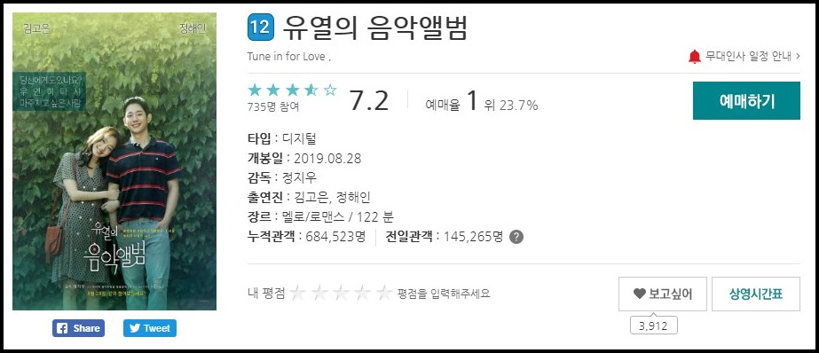 개봉과 동시에 영화예매 순위 1위를 차지하고 있는 영화는 유열의 음악 앨범입니다.