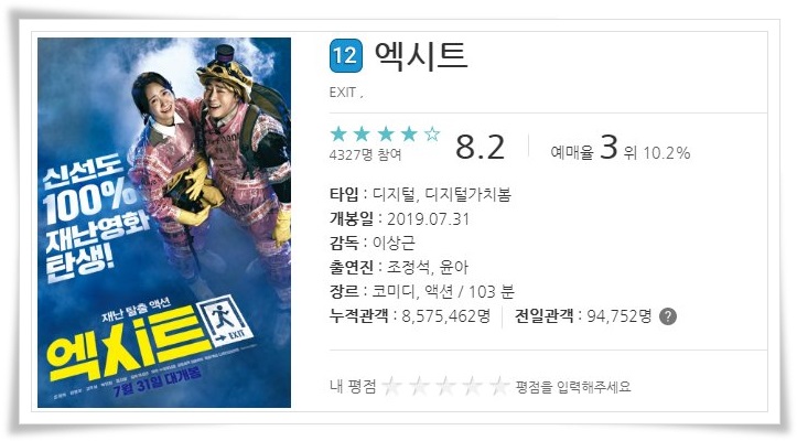 김천 메가박스 영화 예매율 3위는 꾸준한 사랑을 받고 있는 엑시트가 차지했습니다. 아직 안 보신 분들 있으면 꼭 추천드리고 싶은 영화인데요.
