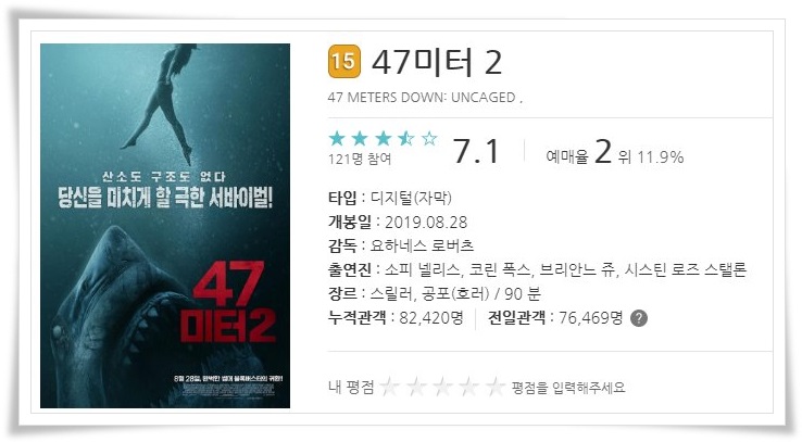 메가박스 영화예매 순위 중 2위는 47미터 2가 올라와 있습니다.