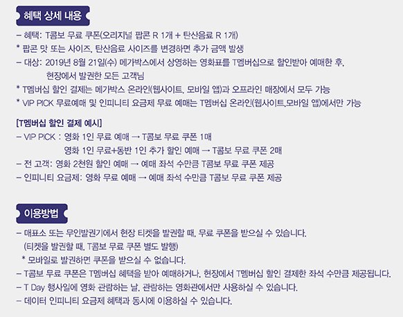 | 메가박스 콤보세트 무료쿠폰 받는법 안내 (T콤보 무료) (0) | 2019.08.15 |