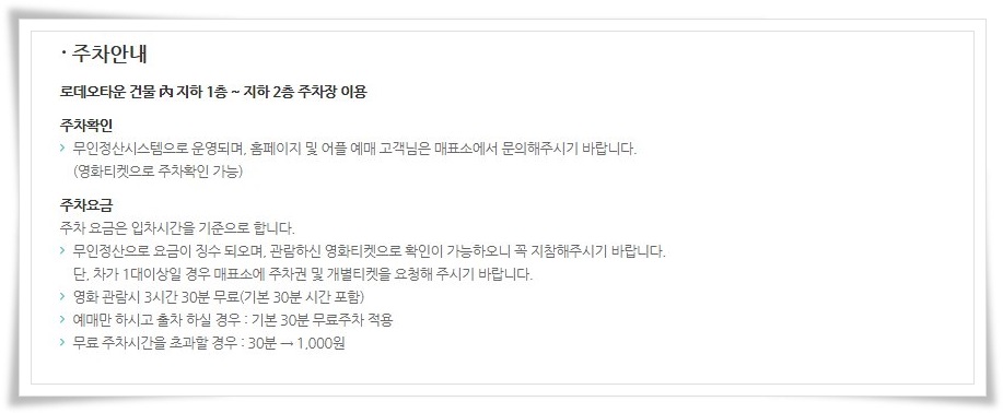 대전 메가박스 주차장은 지하 1층부터 2층까지 이용이 가능합니다. 주차요금의 경우 당일 영화 관람 시 3시간 30분의 무료주차를 제공하고 있습니다.