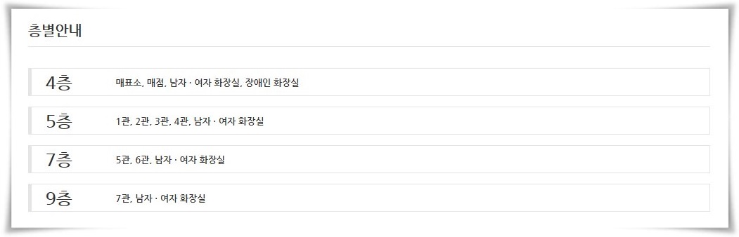 매표소는 4층에 있고 영화 상영관은5층, 7층, 9층에 위치하고 있습니다.