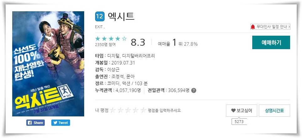 현재 영화예매 순위를 살펴보면 대부분의 국내 3대 영화관인 CGV, 메가박스, 롯데시네마에서 예매율 1위를 달리고 있는 영화가 엑시트입니다.