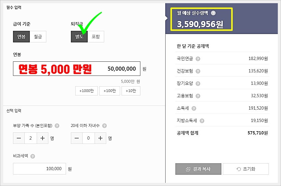 또한 부양가족수와 20세 이하 자녀수에 따라서 공제되는 부분이 있으며 비과세액에 따라서도 조금씩 바뀌기 때문에 정확한 연봉 실수령액은 직접 계산을 해보는 것이 좋다.
