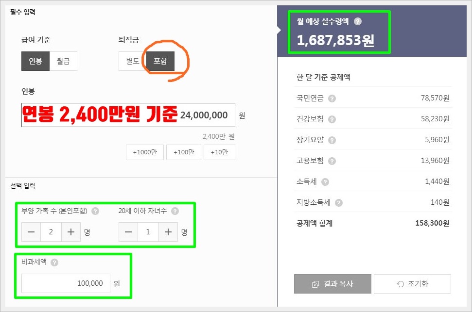 동일한 2,400만원의 연봉을 받는 근로자가 있다고 가정한 후 부양가족수는 2명 자녀 1명으로 설정 후 계산하면 퇴직금이 포함되기 전과 후의 지급액은 차이가 있다.