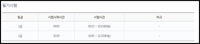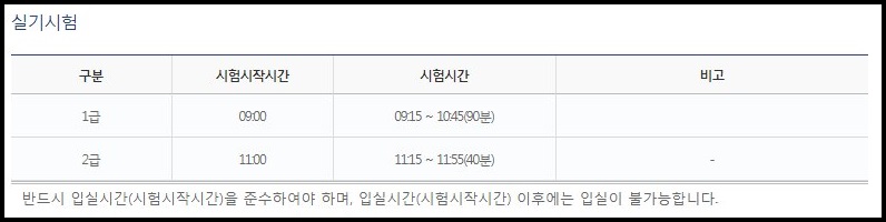 실기시험의 경우 시험 시작 시간이 1급 9시, 2급 11시에 시작을 하게 되며 각각 90분, 40분 동안 시험을 치르게 됩니다.